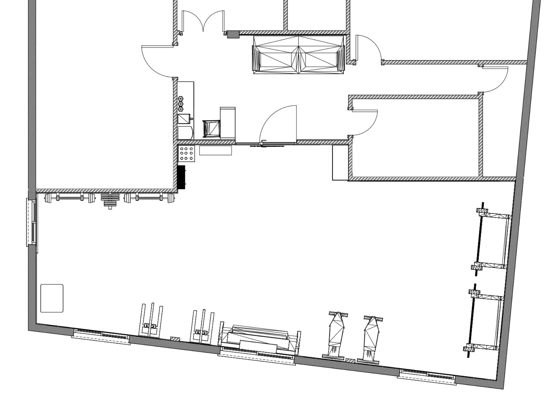 המראות הגדולות מותקנות בזוויות שמרחיבות את תחושת החלל ומספקות למתאמנים פידבק חזותי מדויק לתנועות הגוף. מיקומם של המתקנים תוכנן כך שיאפשר זרימה חלקה ובטוחה במרחב, תוך ניצול מיטבי של השטח. הרצפה מחופה חומר עמיד המותאם לשימוש אינטנסיבי, ושומרת על מראה נקי ומקצועי לאורך זמן.